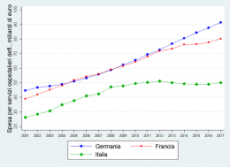 È anche vero che la spesa (depurata dall’inflazione) per servizi ospedalieri dell’Italia è nel periodo 2001-2017 sempre inferiore a quella di Francia e Germania (figura 3). Sempre nel 2017, in Italia la spesa è di 51 miliardi di euro, pari a circa la metà di quella tedesca (96 miliardi) e a due terzi di quella francese (83 miliardi).