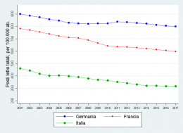 Un altro fenomeno comune a Italia, Germania e Francia sembra essere la riduzione dei posti letto. In particolare, dai dati Ocse sappiamo che in Germania nel periodo 2001-2017 si sono ridotti dell’11 per cento, in Francia del 24 per cento e in Italia del 31 per cento (figura 2).