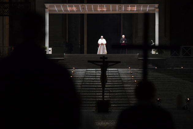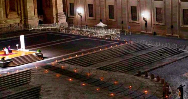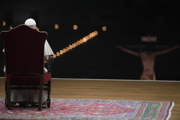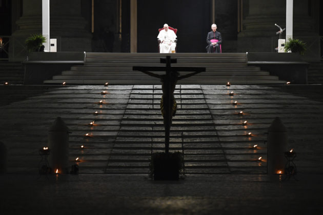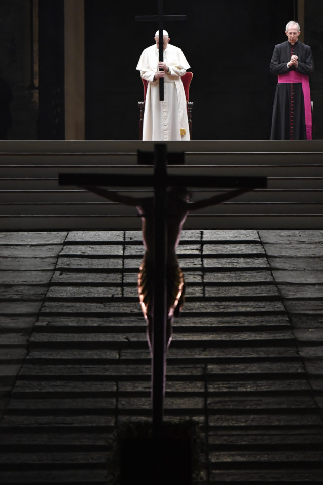 Coronavirus, Papa Francesco presiede il rito della via Crucis in una piazza San Pietro deserta. Con lui medici e agenti penitenziari
