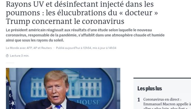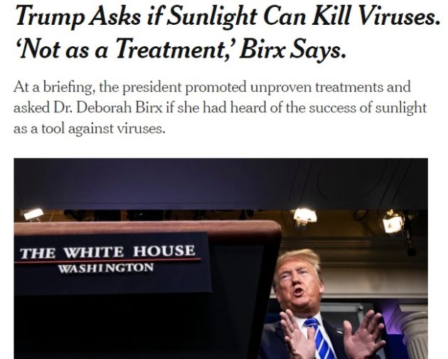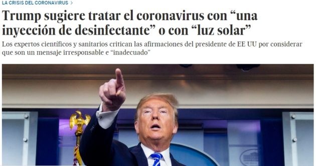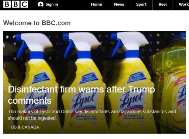 Non solo medici: ora anche gli stessi produttori di prodotti anti-batterici mettono in guardia dalle dichiarazioni del presidente americano Donald Trump, che ha ipotizzato che la cura possa venire dall’iniezione di disinfettanti nel corpo, dalla “cura del sole” e dai raggi ultravioletti. E anche i media nel mondo dal New York Times alla Bbc, avvertono sulle “cure pericolose” del “dottor Trump”.