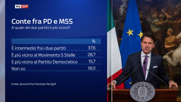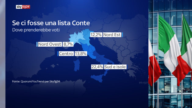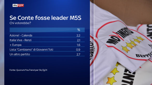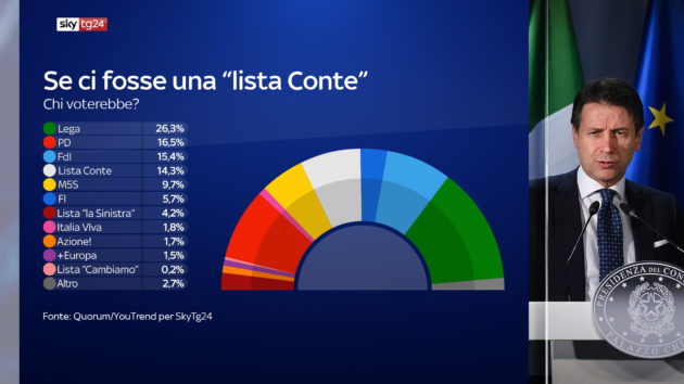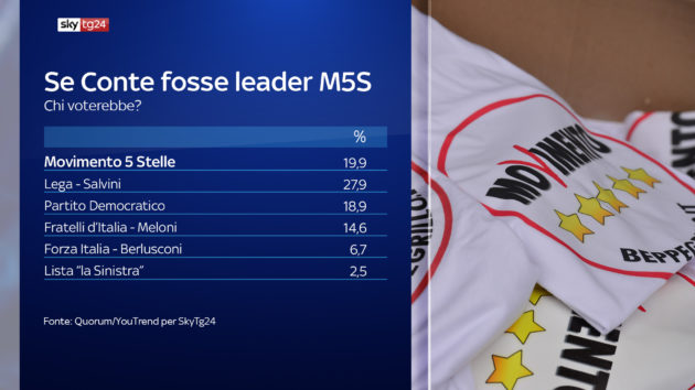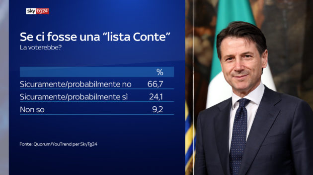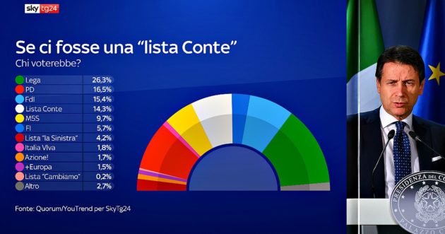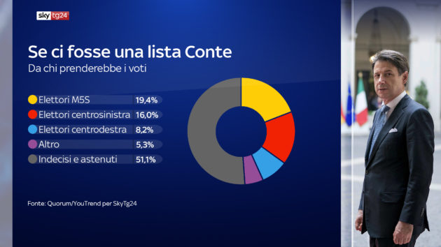 Un partito “terzo”, indipendente da M5s e Pd, guidato dal presidente del Consiglio Giuseppe Conte, potrebbe valere più del 14 per cento. Una forza politica che non rivoluzionerebbe lo scenario politico, ma cambierebbe parecchi equilibri, non solo nel centrosinistra e nell’area di governo. Il dato è stato elaborato da un sondaggio Quorum/YouTrend diffuso da SkyTg24.