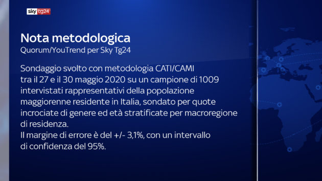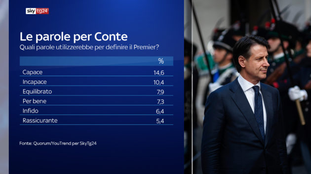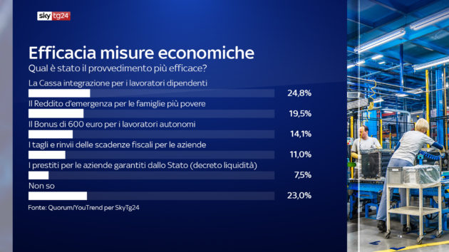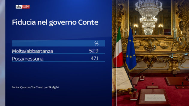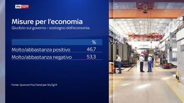 Una maggioranza di intervistati ha ancora fiducia nel governo: è il 53 per cento. Il dato risente certamente del giudizio positivo sull’operato dell’esecutivo durante l’emergenza Coronavirus, come si vede dallo storico da gennaio ad oggi. Una quota di intervistati vicina al 71 per cento ha un’opinione positiva sull’azione del governo per la tutela della salute. La stessa fiducia di certo non c’è per quanto riguarda le iniziative del governo in materia di economica: il 53 per cento esprime un giudizio negativo.