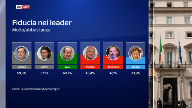 Poi però c’è il vero indice di fiducia nei leader. E il dato per Conte è confermato: è sostenuto dal 57 per cento degli intervistati. Lo supera – di 2 punti – solo l’ex presidente della Bce Mario Draghi, indicato dai giornali come eventuale alternativa a Palazzo Chigi e probabile candidato al Quirinale al termine del settennato di Sergio Mattarella. Dietro a Conte c’è, come risulta anche da altri istituti di sondaggio, il presidente della Regione Veneto Luca Zaia, che sfiora il 50 per cento. Ma precedono tutti i leader di partiti anche altri due governatori: quello della Campania Vincenzo De Luca (oltre il 43) e quello dell’Emilia Romagna Stefano Bonaccini (37). Il primo leader di una forza politica arriva al 33 per cento, è la presidente di Fratelli d’Italia Giorgia Meloni.