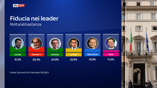 A stretto giro ci sono il segretario della Lega Matteo Salvini (31) e quello del Pd Nicola Zingaretti (30). Sotto la soglia del 30 ci sono il presidente della Regione Lombardia Attilio Fontana (24,7) e il ministro degli Esteri Luigi Di Maio (22,5). Sul filo del 20 sta l’ex premier e presidente di Forza Italia Silvio Berlusconi. La certezza di tutti i sondaggi di queste settimane è l’ultimo posto del leader di Italia Viva Matteo Renzi inchiodato all’11.