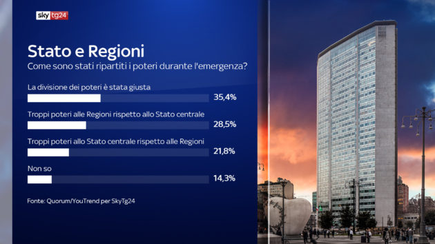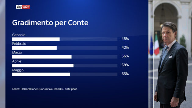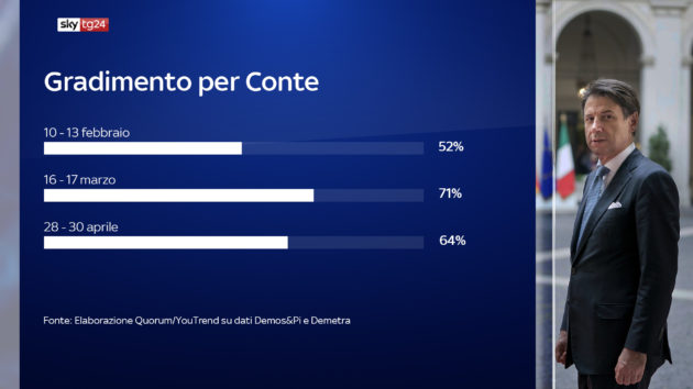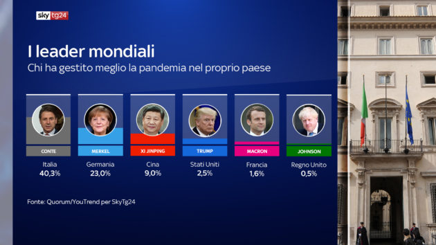 numeri descritti fin qui si legano tutti con gli indici di gradimento per il governo e di fiducia personale nei confronti del suo presidente. Per esempio, secondo il campione necessariamente tutto italiano intervistato da Quorum/YouTrend, Conte è stato tra i leader che si sono mossi meglio durante l’emergenza per la pandemia. Le cifre, bisogna dire, danno l’idea di una certa influenza del campanilismo tra chi ha risposto al sondaggio.