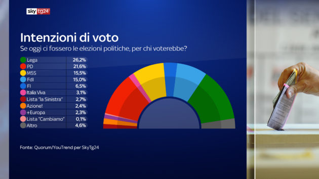 Tornando alla realtà del presente, secondo i dati elaborati da Quorum/YouTrend, sarebbero meno di 5 i punti di distacco tra la Lega – primo partito un po’ sopra il 26 – e il Pd, primo inseguitore al 21,6. Il vero duello senza esclusione di colpi sembra in questi giorni quello tra M5s e Fratelli d’Italia, separati di un solo mezzo punto. Continua a galleggiare tra il 6 e il 7 Forza Italia, mentre Italia Viva supera di poco il 3, seguita a pochi decimali dalla Sinistra, da Azione di Carlo Calenda e da +Europa.