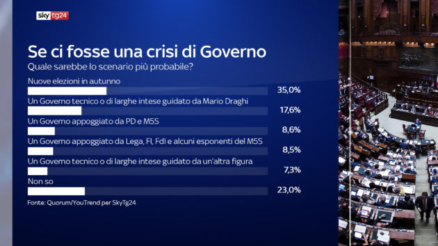 Infine, se ci fosse una crisi di governo, quale sarebbe strada da percorrere secondo gli intervistati di Quorum/Youtrend? Una maggioranza relativa (uno su 3) vuole andare direttamente a nuove elezioni politiche da tenersi in autunno. Risposta “falsata” dal fatto che prima di andare alle urne serve obbligatoriamente passare prima dal referendum costituzionale per confermare o meno il taglio dei parlamentari. Questa consultazione sarà fissata verosimilmente nella seconda metà di settembre. Un governo di unità nazionale, tecnico o di larghe intese guidato appunto da Mario Draghi in questo momento ottiene il consenso del 17 per cento. Ancora più minoritarie le ipotesi di un nuovo governo Pd-M5s (magari con un altro premier, come sostengono alcuni retroscena giornalistici) o di un governo “sovranista” con Lega, Fdi e un pezzo di M5s.
