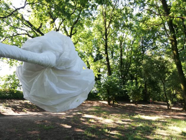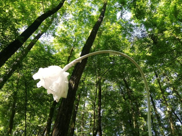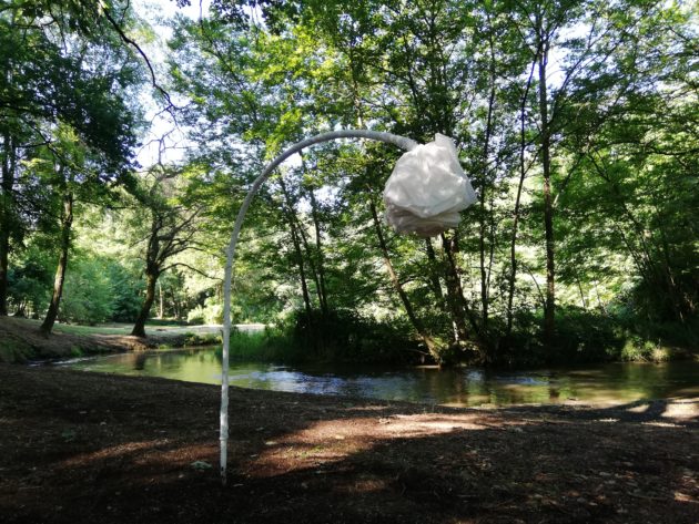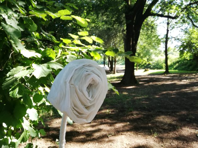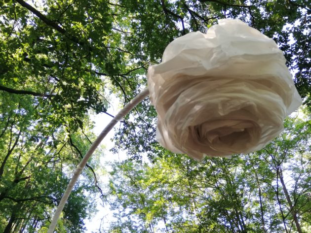 Fra i suoi primi lavori, un prato tutto ricoperto di sacchetti bianchi di plastica. Anche allora, tutti riciclati. “Dalle cose che buttiamo via si possono leggere le nostre vite. Cosa mangiamo, cosa beviamo, come ci vestiamo, se stiamo male o bene. Con il tempo, ho capito che il sacchetto era il simbolo che racchiudeva tutto quello che intendevo dire”, continua. L’oggetto protagonista del consumismo, usato per lo shopping. Ma anche il rifiuto che ne contiene altri. “Quindi, ho iniziato a raccoglierli dove li trovavo e a usarli per le mie opere. Nei primi momenti li ho comprati, soprattutto se mi commissionavano lavori su ampia scala. Ma sempre più spesso li raccolgo da terra, ne trovo in giro. La gente che mi conosce li tiene da parte e me li dà quando ci incontriamo. Ora ho un magazzino pieno”. Quelli che compongono i fiori della Vernavola sono già stati presenti in molte altre mostre: “Li ho già utilizzati in passato e li riuserò in futuro. Ho cercato di disporli in modo tale che stiano al riparo dai raggi del sole, per evitare che vengano danneggiati. Bisogna prendersene cura”, prosegue Borgna.