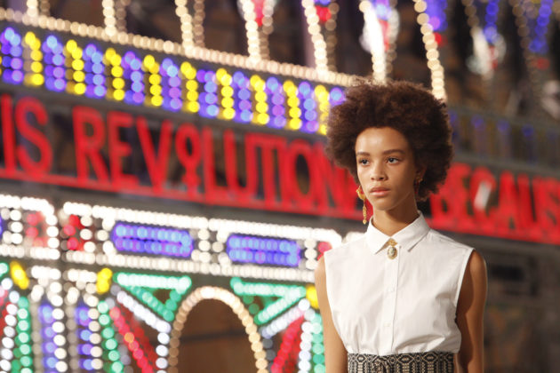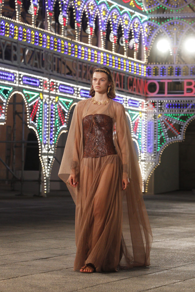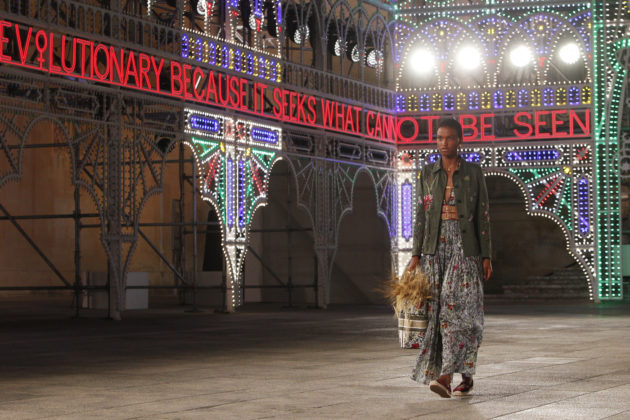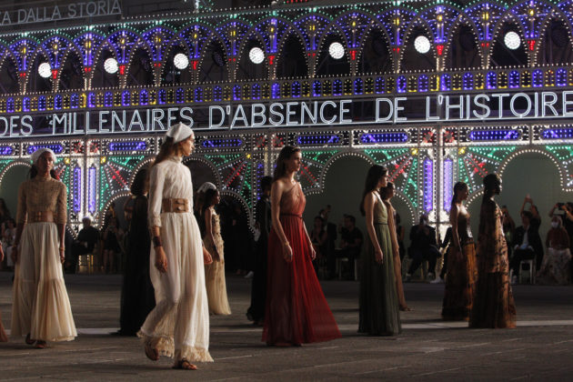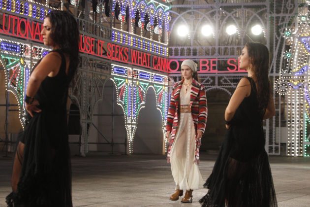 “Strenght and dignity”, “forza e dignità” si leggeva tra le frasi scritte nelle oltre 30mila lampadine a Led che componevano la straordinaria scenografia luminosa pensata per l’occasione dall’artista Marinella Senatore. Proprio queste sono le due caratteristiche principali del popolo salentino, in particolare delle donne. Quelle stesse donne descritte dai canti popolari della “pizzica” che facevano da sottofondo alla sfilata come “tarantolate”, in preda alla pazzia indotta dal morso del ragno, ma che altro non era per loro se non un’occasione di riscatto, per lasciarsi andare e farsi ammirare con quei lamenti che diventavano melodia e quel loro movimento frenetico diventato un ballo ammirato e apprezzato ora in tutto il mondo. L’emblema di queste donne, “forti e dignitose”, è il fazzoletto legato in testa, quello scampolo di stoffa indossato con orgoglio dalle nostre nonne, simbolo di fatica, sudore e schiene incurvate dal lavoro dei campi, che ora Maria Grazia Chiuri recupera dal cassetto della memoria e lo fa sfoggiare alle sue modelle, in uno stile contadino-bohémien.