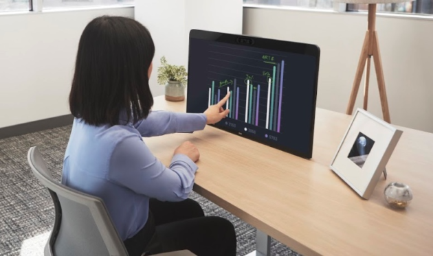 Nella cornice superiore del touchscreen da 27 pollici sono state collocate tre webcam intelligenti. Queste sono coadiuvate da ben otto microfoni che, oltre a catturare in maniera particolarmente efficace la voce dell’utente, garantiranno anche la soppressione dei rumori di fondo. In questo modo sarà possibile effettuare videochiamate soddisfacenti anche all’interno di ambienti rumorosi come possono essere gli uffici ma anche le abitazioni, nelle quali lo spazio per il lavoro deve spesso essere condiviso con gli altri membri della famiglia. Ma non è tutto.