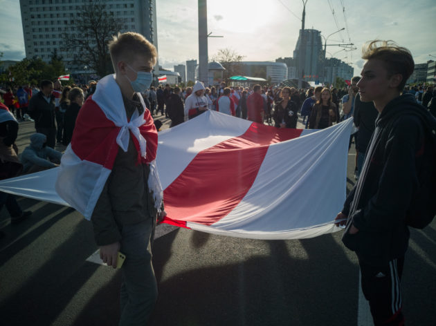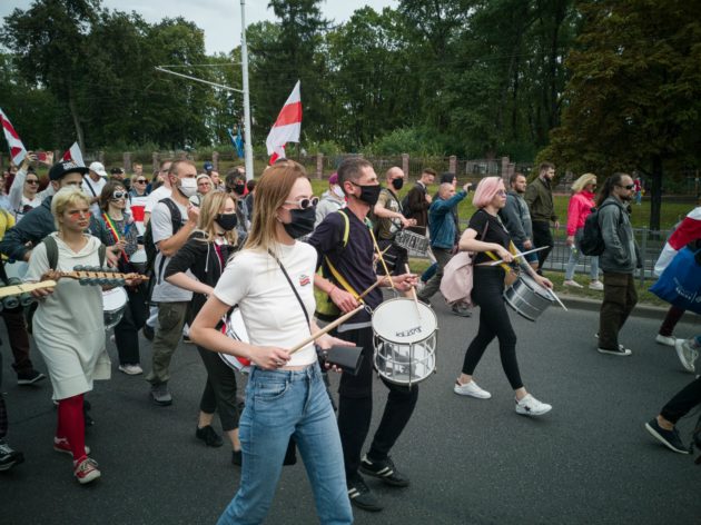 A dimostrazione che la popolazione non ha più paura, molti si riuniscono nei cortili delle case e nei quartieri per cantare, discutere, ascoltare musica popolare. È un momento conviviale, dove famiglie portano da mangiare, allestiscono bancarelle. Le bandiere a strisce bianche e rosse – che rappresentano la bandiera nazionale prima che il presidente Alexander Lukashenko cambiasse i colori in verde e rosso – sventolano ovunque. “Finalmente la popolazione si è svegliata. Ha capito che deve combattere per i propri diritti e che ha il potere di scegliere chi votare” dice Aleksej, 38. Da questi incontri partono poi tutti i cortei giganteschi, chiaramente proibiti dalla legge (e la polizia lo fa notare con il megafono molto spesso, ricevendo come risposta una ola di fischi e grida di felicità).