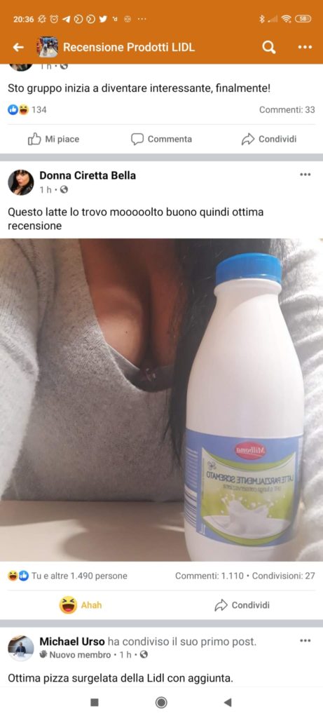 Nei commenti complimenti e proposte esplicite verso il ragazzo piovono a decine. Sempre sul versante maschile un’altra utente ha postato la foto del marito mentre lecca un dolcino al cioccolato e sotto, nemmeno a dirlo, riparte la rumba di commenti a profusione con profferte di ogni genere al marito. Insomma, in poche ore la pagina si riempie di foto dove al centro dell’attenzione finiscono più il fascino, le misure e gli sguardi dei consumatori che il prodotto. Molte ragazze si sono oltretutto sbizzarrite: c’è chi ha subito indossato leggings mozzafiato, chi jeans skinny strettissimi per risaltare le proprie forme, infine l’apoteosi. Una giovane utente posta una foto dove il soggetto dovrebbe essere la bottiglia di latte acquistata, ma dietro al prodotto si intravede solo una parte del corpo della ragazza, avvolto in una succinta maglia di lana molto ma molto aperta sul petto e la scritta: “Questo latte lo trovo molto buono, quindi ottima recensione”.