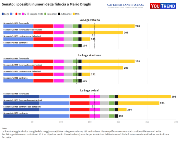Senato – In Senato la maggioranza assoluta è di 161 voti a favore. Il governo Conte 2, nell’ultimo voto in Aula, ha ottenuto 156 sì, 140 no e 16 astenuti. Per YouTrend e Istituto Cattaneo Zanetto Draghi potrà contare in partenza sul alla fiducia di 136 senatori. A Palazzo Madama si replica quindi la stessa situazione di Montecitorio: se la Lega votasse no, servirebbe il sì del M5s per arrivare alla maggioranza assoluta. E viceversa. Per arrivare alla maggioranza semplice, anche in questo caso, basterebbe l’astensione di Matteo Salvini e colleghi.