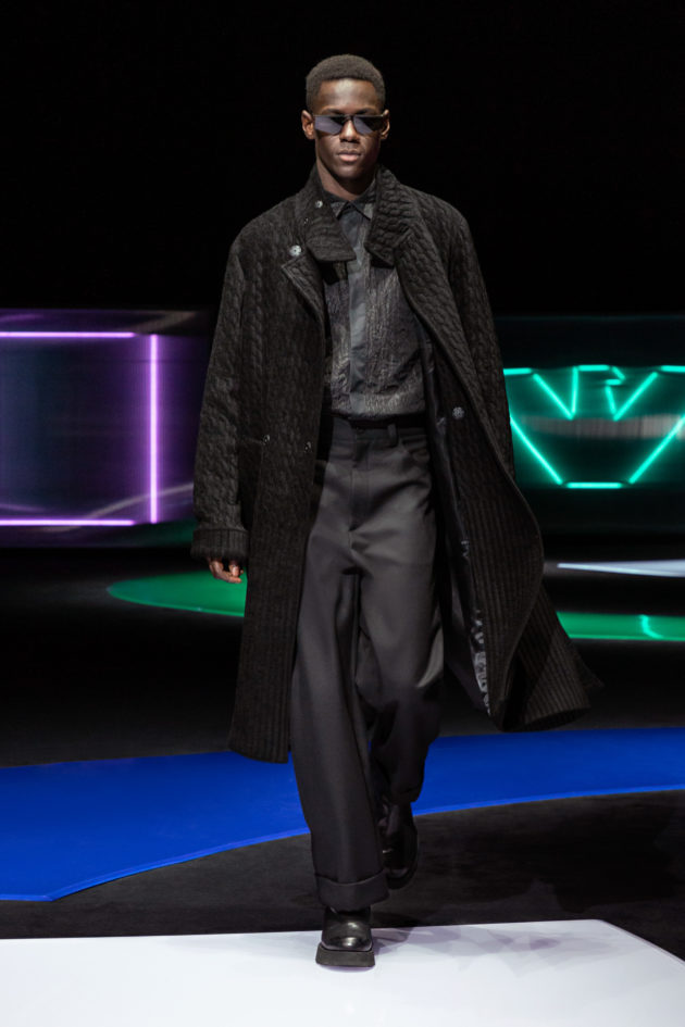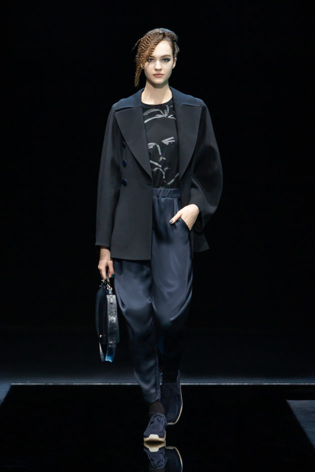 E così, intorno a lui, sotto il suo sguardo stoico, nel Teatro sfilano una dopo l’altra le creazioni della nuova collezione autunno/inverno ’21-’22 Donna e Uoma di Giorgio Armani. Creazioni sublimi, eteree ed essenziali, semplici ma sofisticate, pensate per donne e uomini che non hanno bisogno di ostentare per affermarsi. Anzi. I modelli sembrano fluttuare nell’oscurità profonda e rarefatta, spezzata solo dal bianco abbagliante del logo GA proiettato sul pavimento, al centro della scena. Maschile e femminile si compenetrano nei sublimi tailleur a pantalone, capaci di esaltare la femminilità seducente racchiusa nel rigore di una giacca. La loro unione diventa dialogo tra uomo e donna, giorno e notte, tra il nero e il blu, tra eleganza e vezzo: ne scaturisce un’eleganza senza tempo e, soprattutto, senza mode.