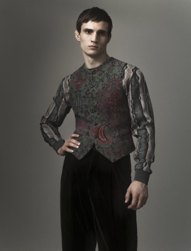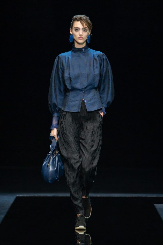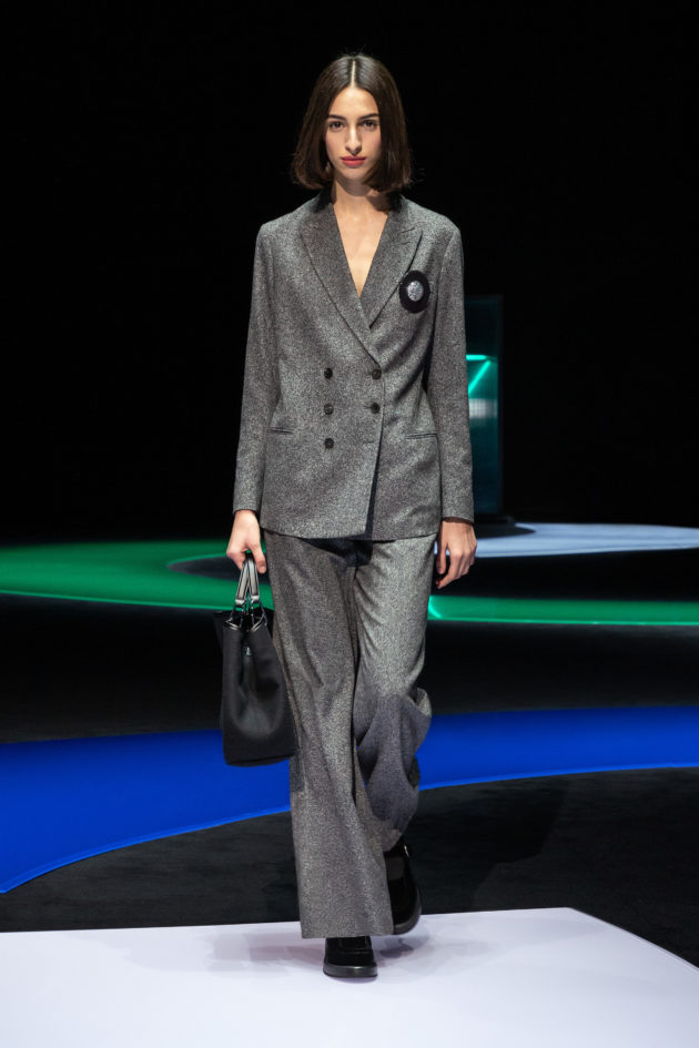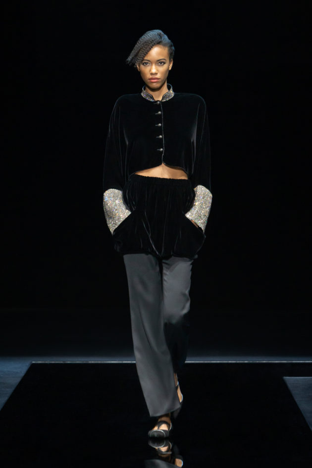 L’incedere di queste donne fasciate in pantaloni ad ala di purissima seta è ipnotico: sembra quasi di percepire sulla propria pelle il contatto avvolgente, nelle orecchie risuona il delicato fruscio del tessuto. Re Giorgio è riuscito a esprimere massima coerenza non solo tra i capi, ma anche tra le collezioni (Donna, Uomo, Emporio e Alta Moda), declinando in tutte le forme la poetica della gentilezza che lo ha guidato del concepire questi abiti. L’autenticità dell’Armani pensiero si riflette nel gioco di sottrazioni, nel preziosismo dei tessuti e nella brillantezza che emanano anche le tinte più tenuti. Ritroviamo i motivi floreali disegnati con le paillettes sui lunghi abiti da sera d’ispirazione botticelliana che già abbiamo visto nell’Alta Moda, ma anche i giochi di rouches che vanno a valorizzare i colli di bluse e camicie, sbocciando da sotto le giacche. E il velluto, morbido e sofficissimo, di quel nero profondo simbolo di Armani. Poi cristalli, pennellate di tinte acquose e fiabesche, dal turchese al cobalto al rosa pallido, boules planetarie, punti di luce chiamati a spezzare il rigore milanesissimo dei grigi e dei greige.