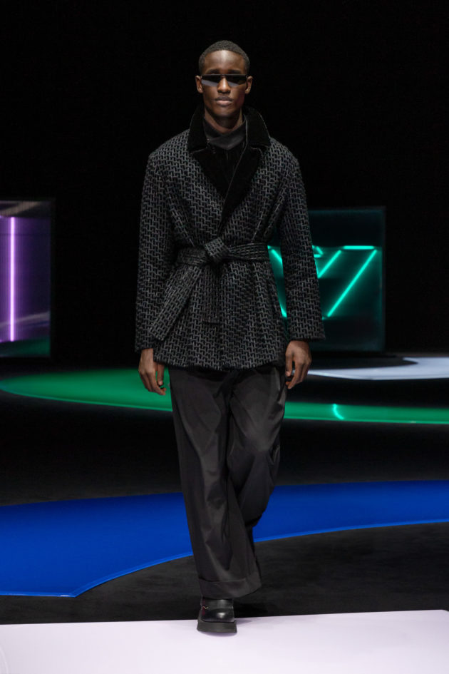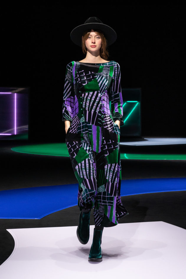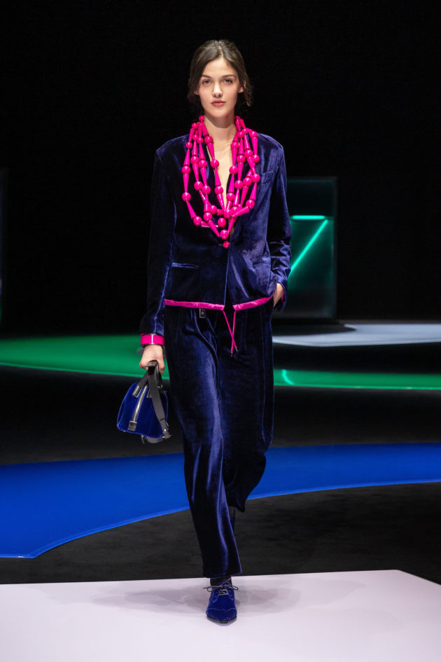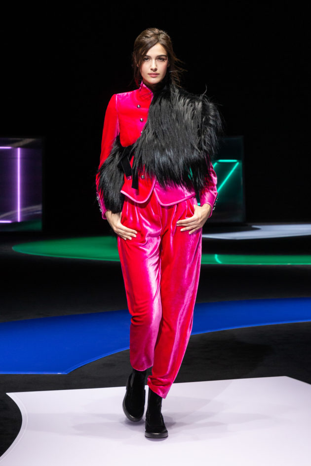 Tutt’altra atmosfera invece per Emporio Armani, un’esplosione in technicolor che emana energia vitale, vibrazioni pop in puro stile anni ’80, con “richiami ai neon del paesaggio metropolitano: lo scenario ideale – spiega Giorgio Armani – che alimenta la mia ispirazione per la donna e l’uomo Emporio Armani”. Sia la proposta per lui sia quella per lei “sono percorse – dice lo stilista – da un richiamo evidente ai volumi e alle forme dei miei personali anni Ottanta: un periodo indimenticabile, cui mi riferisco senza nostalgie. Del resto, proprio quest’anno Emporio compirà quarant’anni: un traguardo importante, che mi ha fatto guardare alle radici, reinterpretando i volumi sciolti, le forme decostruite, i giochi di maschile e femminile e i colori con lo spirito di oggi”. Anche qui il velluto la fa da padrone, accostato a suadenti fantasie geometriche e schizzato con sorprendenti pennellate fucsia, viola e verdi. Morbidezza è la parola chiave, ma con tanta voglia di tornare a vivere.