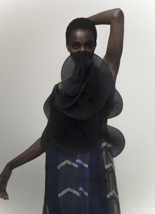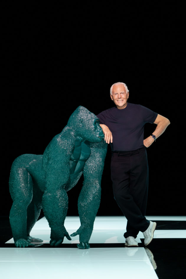Uri. Tutto inizia e ruota intorno a lui. Intorno a questo fiero e maestoso gorilla verde brillante, unico focus di colore nel nero assoluto dell’Armani Teatro. Il suo nome è un termine biblico, significa “focoso“, e la sua presenza è fortemente simbolica. Giorgio Armani ha scelto questo esemplare, riprodotto a grandezza naturale, per ricordarci, ancora una volta, l’importanza di mettere al centro il nostro pianeta e la salvaguardia dell’ambiente. Non è un caso, infatti, che quest’opera, realizzata Marcantonio Raimondi Malerba come copia del primate proveniente da un set cinematografico che lo stilista tiene nel salotto di casa, sia verde, colore simbolo dell’ambiente. “È un elemento eccentrico, di forte contrasto con l’ambiente domestico che lo ospita – spiega Armani -. Riflette il mio grande amore per gli animali e la natura e contribuisce a creare, con leggerezza, una sorta di oasi nella mia casa di Milano. Ho pensato di metterlo al centro della scena perché mi sembra fondamentale, oggi più che mai, ricordare in ogni occasione quanto sia importante la salvaguardia del mondo naturale. Il mio impegno su questo fronte è grande”. Ed è proprio alla spalla di Uri che lo stilista si appoggia, sul finale, con fare familiare: un gesto che concretizza il suo desiderio di comunicare in modo diretto, personale, senza filtri. A cuore aperto.