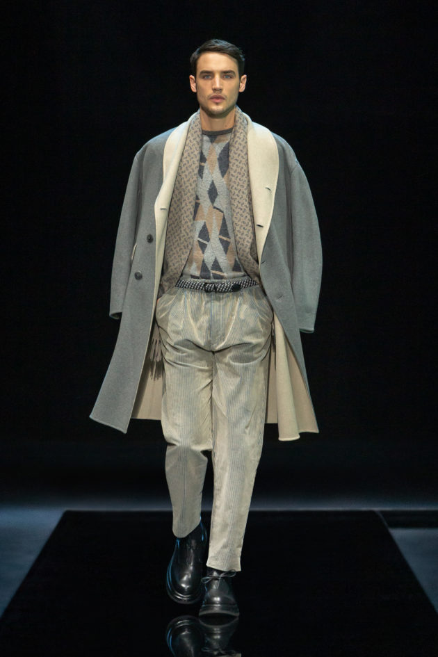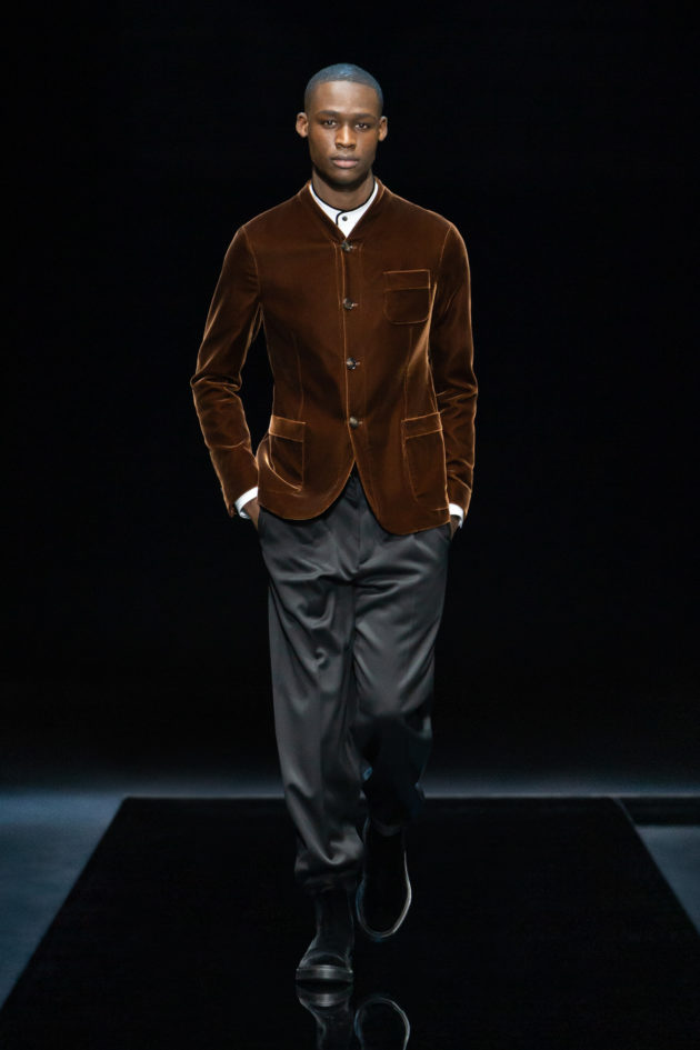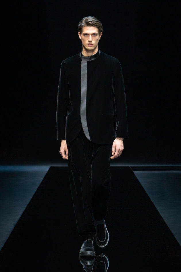 Canoni che ritroviamo declinati anche nell’Uomo Armani, un articolato guardaroba tributo a un film, American Gigolò, che fissò per sempre nella memoria collettiva l’immagine di un uomo intento a scegliere con cura cosa indossare. D’altra parte, lo stilista ha sempre scavato e indagato la psicologia del vestire, rimanendone affascinato. E la sua nuova collezione maschile è proprio questo: una raccolta di capi che, aggiornati, attraversano le decadi in rapidi passaggi, per consegnare il ritratto di uomo disinvolto e consapevole, naturalmente elegante. Al centro c’è ovviamente lei, la giacca soft, svuotata e destrutturata, riattualizzata nei tessuti. A dare un tocco di eclettismo ci pensano i tessuti tecnici dei capispalla e i volumi ma il vero must è la nuova camicia di velluto: un capo che non ha bisogno d’altro, neanche di una giacca. Basta lei, ed è subito sera.
