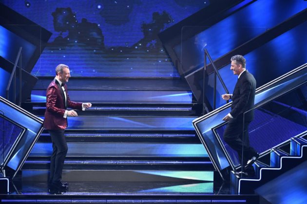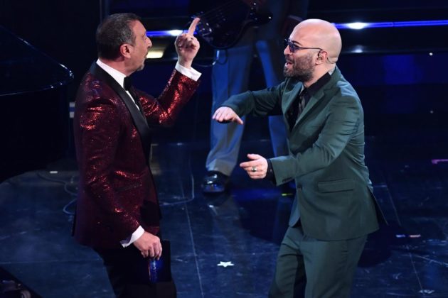 Fiorello: voto 8 – Stessa storia, stesso posto, nuovo completo di Giorgio Armani. Questa volta un doppiopetto gessato con minuscoli cristalli neri disposti in righe verticali. Sempre elegantissimo.