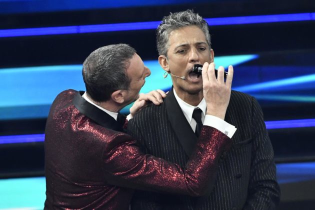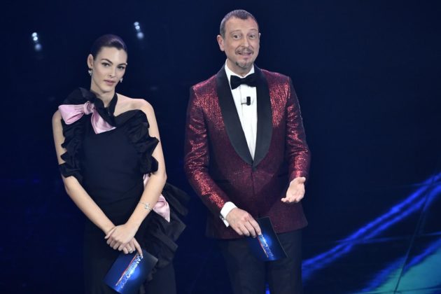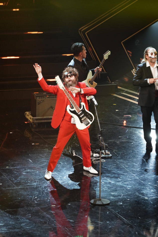 Maneskin: voto 8 – Damiano ci crede e si sente un po’ il nuovo Achille Lauro. Però questo look un po’ bohemienne un po’ corsaro, con la camicia di seta maxi che sbuca da un lezioso corsetto di pelle rosa by Etro è super approvato. Capelli tirati, smalto, anelli dorati: il look è lo stesso per tutti e fa centro. Con loro Manuel Agnelli in Emporio Armani.