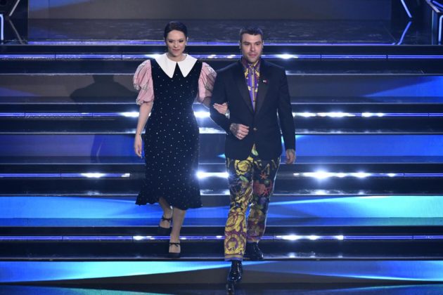 Fedez e Francesca Michielin: voto 7 – Lei in modalità scolaretta è davvero deliziosa. Maniche a sbuffo over rosa baby impreziosite da cristalli e colletto candido da educanda su un tubino in velluto nero con cristalli, tutto Miu Miu. Lui replica con le nuovissime (e super modaiole) stampe di Versace: camicia e pantaloni multicolor (con la scritta “famiglia”) bilanciati da una sobria giacca nera. Dettaglio: la spilla a sostegno di Scena Unita, il movimento dei lavoratori del mondo dello spettacolo.