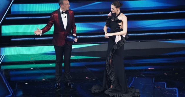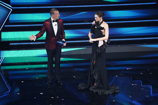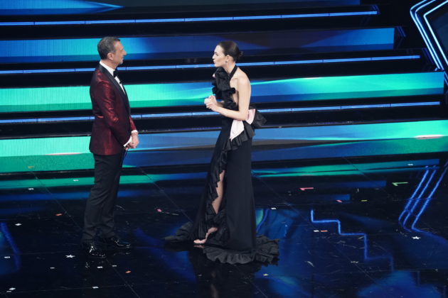 Vittoria Ceretti: voto 9 – Il primo look è uno strepitoso Valentino Haute Couture SS20 che conquista tutta la scena. Crêpe e volant di taffetà nero lucido con scollo all’americana e spacco profondo a sottolineare l’orlo in sbieco, impreziosito da fiocchi rosa candy. Orecchini di rubino con cascata di diamanti di Bvulgari completano il look. Bella, bellissima. Il secondo abito invece è un Giorgio Armani Privé con un delicatissimo pavé di cristalli color champagne. Sembra dipinto addosso, con quella morbida linea a bustier che valorizza il suo fisico e il portamento da top model. Fiorello imita il fotografo Mario Testino e finalmente Vittoria Ceretti si sente pienamente sé stessa.