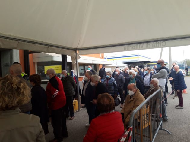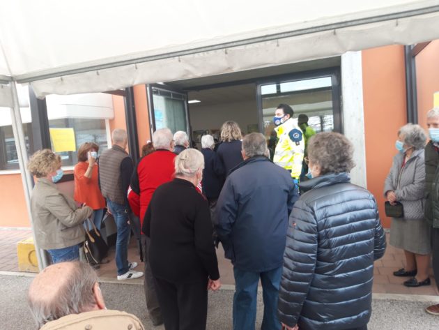 La voglia di vaccino è così grande che gli ottantaquattrenni di Treviso, accompagnati da badanti, figli o parenti, si accalcano al Bocciodromo di Villorba per ricevere la loro dose benedetta. Attendono da così abbondante tempo l’antidoto al Covid, in una regione che solo ora ha raggiunto il 50 percento delle vaccinazioni (prima dose) per gli ultraottantenni, che non si curano del distanziamento tanto invocato. Le foto, scattate poco dopo le 14 di domenica 28 marzo, sono eloquenti. Auto in coda. Poi gli anziani si mettono in fila, in piedi, stretti stretti, con il foglietto ricevuto da un addetto alla Protezione Civile e con la tessera sanitaria. Passaggio nell’atrio per misurare la temperatura, accalcati. Poi entrano nella grande sala, con le sedie in legno allineate. Non sono le comode poltrone, dal distanziamento infinito, come quella su cui è stato fotografato il presidente Sergio Mattarella. Qui è tutto molto più rustico, stile Razza Piave. E c’è anche molto meno spazio. “Non mi pare ci sia ressa. In prima fila ci sono quelli in attesa della vaccinazione, nelle altre file quelli che aspettano di vedere che non ci siano problemi per l’iniezione” replica, all’obiezione piuttosto ovvia, la dottoressa che ha il controllo di uno dei quattro punti di vaccinazione aperti in questa domenica di fine marzo nel Trevigiano. Un esperimento provato anche a Oderzo, Riese Pio X e Godega di Sant’Urbano, per una corte di 4.700 trevigiani. E’ stato presentato come una trovata del governatore Luca Zaia: farsi vaccinare senza aspettare la convocazione dell’Uls, forse per evitare le complicazioni (che non sono poche) di lettere e telefonate che partono dalle Aziende Sanitarie venete.