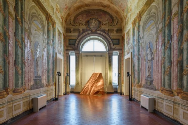 Si apre con We the people di Dahn Vo (uno dei 250 elementi in cui l’artista ha scomposto la statua della Libertà), che dialoga con le statue di Minerva e Mercurio raffigurate negli affreschi barocchi della sala. Si prosegue con il “Tree Jesus”, un Gesù “ingabbiato”, realizzato dall’arcinoto duo artistico Gilbert and George. C’è l’opera evocativa di Kounellis, cappotto strappato con coltello infilzato, c’è la donna accovacciata di Ryan Mendoza intitolata Don’t Worry, she likes it. L’artista tedesco Daniel Knorr interpreta La Giustizia come una statua di gesso con testa incappucciata a mo’ di terrorista. Molto arcimboldesco l’opera, “ In Rainbows” dell’artista Trey Abdella. L’opera decoupage dell’argentino Rirkrit Tiravanija. “Solo Necessita Dinamita, Green Go…” evoca gli anni bui della dittatura.