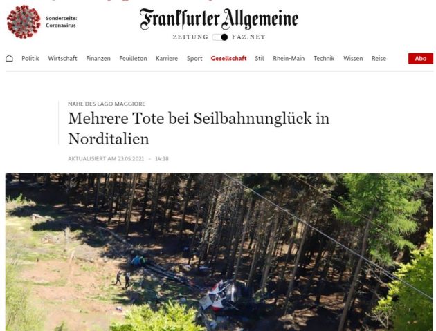 La notizia della tragedia della funivia precipitata sul Mottarone, in Piemonte è stata rilanciata in tutto il mondo. Il sito del britannico Guardian gli dedica l’apertura, “Incidente in una funivia in Italia, almeno nove morti” è il titolo, mentre nell’articolo si spiega che “a terra si vede il relitto di una funivia, dopo che è crollato vicino alla sommità della linea Stresa-Mottarone nella regione Piemonte”. Apertura anche per la Bbc: “Una funivia crolla vicino al Lago Maggiore”. L’emittente pubblica cita un portavoce del soccorso alpino italiano che parla di “incidente molto serio”.