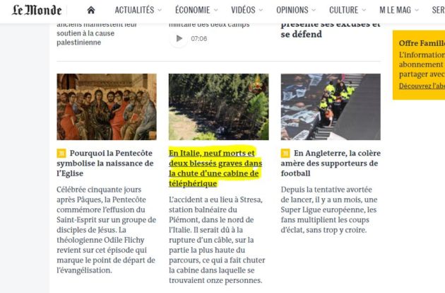 Tragedia della cabinovia sul Mottarone, la notizia sui giornali di tutto il mondo