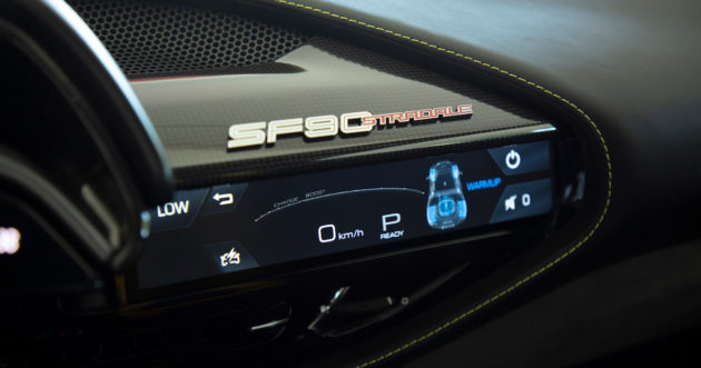 Dopo una tale mole di informazioni serve un bel respiro profondo per sedersi al volante della SF90 Assetto Fiorano: c’è inevitabilmente un po’ di soggezione sapendo che ci sono mille cavalli pronti sotto il piede destro e tanta elettronica che lavora per esprimerli al meglio. Come se non bastasse gli interni sono totalmente inediti rispetto ai modelli precedenti e richiedono un piccolo apprendistato: debutta infatti il display digitale 16” multifunzione, il volante con superfici touch per il controllo dei menù, il doppio manettino per powertrain ed elettronica ed i comandi della trasmissione integrati nel “cancelletto” centrale.