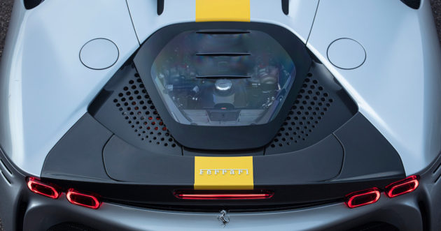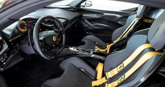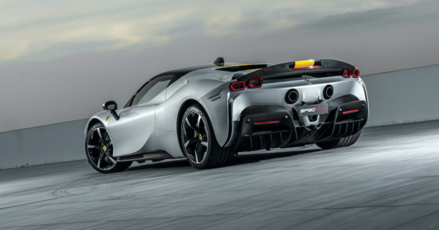 Sotto la scocca, che deriva dalla 488 ed F8 ma introduce anche l’uso del carbonio, sono invece previsti nuovi profili aerodinamici che stabilizzano il frontale senza sporcare il design, tanto da richiedere di alzare di 15 mm la posizione della pedaliera. Anche il V8 biturbo, pur facendo parte della longeva famiglia F154, è stato profondamente rivisto: cilindrata porta a 4 litri per 780 Cv e 800 Nm totali, turbine con wastegate elettronica in posizione più bassa, iniezione diretta a 350 bar e soprattutto nuovi iniettori al centro della camera di scoppio che hanno permesso di rivedere le testate e i flussi eliminando gran parte del cassoncino dell’aspirazione e del relativo ingombro verticale delle varianti precedenti. L’insieme degli interventi ha permesso di abbassare il motore di 15 mm e di ridurne il peso di 25 kg. Il cambio da parte sua è un nuovo automatico doppia frizione otto marce a carter secco privo di retromarcia, che si ottiene usando i motori elettrici anteriori. E’ più veloce del 30% rispetto al precedente 7 marce, regge picchi di coppia di 1200 Nm pur pesando 10 kg in meno e con l’ottava marcia di riposo permette di ridurre fino al 5% i consumi.