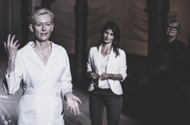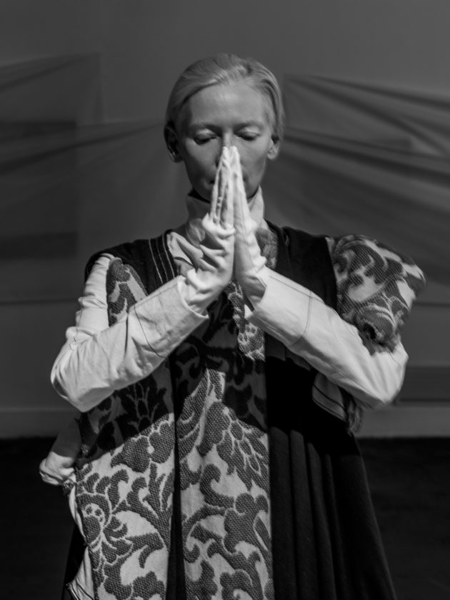 L’effetto del gesto artistico creato dalla magnetica Tilda è indimenticabile e unico nel suo genere: con il suo corpo inconfondibile si mette in dialogo (meta)fisico e simbolico con una quarantina di costumi di culto, all’epoca disegnati da Danilo Donati per le opere di PPP, dal Vangelo Secondo Matteo, a Uccellacci e uccellini, Edipo Re, Porcile, Il Decameron, I racconti di Canterbury, Il fiore delle Mille e una Notte, fino a Salò o le 120 giornate di Sodoma. Spazio e tempo perdono le consuete dimensioni per entrare in un universo che li sovrasta, gli “oggetti” si svuotano del senso originario – che li vuole immoti e silenti come pezzi da museo – per acquisirne uno nuovo, dinamico, secondo una nuova narrazione, immaginifica e visionaria, reincarnata nella pratica evocativa e interattiva con il pubblico. Swinton si fa maestra di uno storytelling struggente, edificato sul proprio corpo di artista dalle diafane fattezze sovrumane, un ultracorpo immune dalla caducità materiale eppure così intimo con la sacra materia. “Sta a lei” ha dichiarato Olivier Saillard “raccontare nei buchi e nei vuoti di una manica cosa fosse un dialogo, uno scambio di attori, una scena”. Embodying Pasolini è promossa da Roma Capitale, organizzata da Zétema Progetto Cultura con la collaborazione di Palazzo delle Esposizioni – Mattatoio e prodotta da StudiOlivierSaillard, con il coordinamento di Aymar Crosnier. Collaborazione artistica di Gaël Mamine.