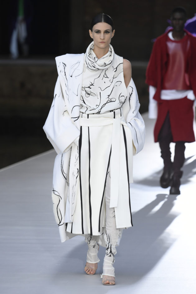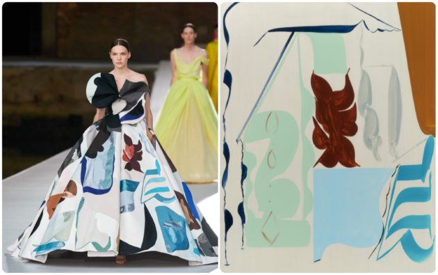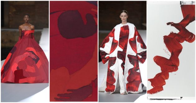 Il risultato è una collezione di dialoghi nei quali dal confronto di due identità ne emerge una nuova, catturata nel vestito. “Bisogna immaginare Valentino Des Ateliers come un concerto di due mondi distinti – pittura e alta moda, arte contemporanea e arte vestimentaria – nei quali le voci ascoltano reciprocamente il canto degli altri prima di pronunciarsi“, spiega il curatore, Gianluigi Ricuperati. Guardiamo, ad esempio, il magnifico look che ha chiuso la sfilata: un capo che nasce dalla storia personale di uno degli artisti coinvolti nel progetto, James Nares, oggi Jamie Nares. Piccioli ha interpretato il percorso di transizione del pittore realizzando un abito iper femminile accompagnato a un maxi coat dal taglio couture per eccellenza: sullo sfondo bianco candido, ha applicato una stampa con le pennellate di Nares nelle sfumature di rosso. Il messaggio è chiaro: il percorso artistico di James va ad inserirsi su una tela bianca, la sua nuova vita da Jamie. “In questo caso la moda è riuscita a ricongiungere una storia – ci dice lo stilista -. Prima il corpo era importante per Nares in quanto strumento pittorico (è un body painter, ndr), oggi invece lo è per la sua vita: in questo capo ci sono la sua arte e l’esaltazione della femminilità a cui oggi lui ambisce”.