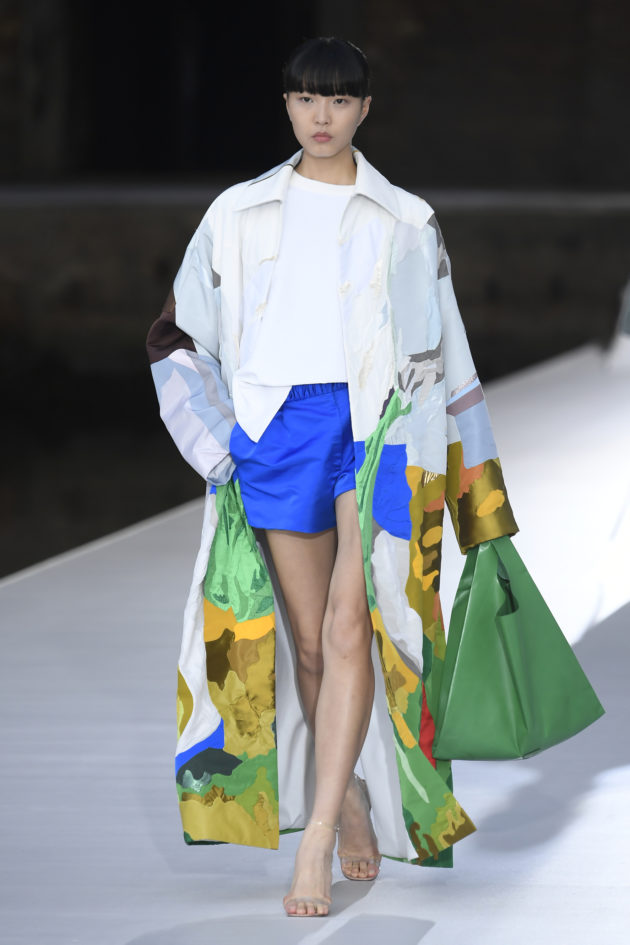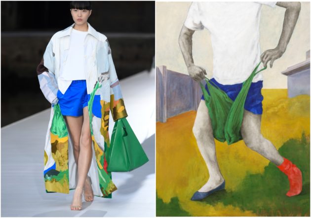 Un altro esempio straordinario di questo lavoro sincronico è quello che Piccioli ha fatto con Alessandro Teoldi: questo artista costruisce le sue opere sul contatto fisico, ricreando la suggestione di corpi che si intrecciano, in una spasmodica ricerca di intimità e contatto fisico. “Questo è proprio ciò che più la pandemia di Covid ci ha negato, per questo ho sentito subito mio questo tema”, spiega ancora Piccioli che ha quindi raccolto tutti gli avanzi di archivio nelle varie sfumature di Rosso Valentino per creare con la stoffa un puzzle di materiali che dà vita alle immagini delle mani che si stringono e si abbracciano dipinte da Teoldi. Ogni esemplare di questo abito maestoso è un pezzo unico, cosa ancora più speciale. E sempre con gli avanzi di lavorazione ha creato anche il minidress e coat ispirati all’opera di Francis Offmann, pittore ruandese che ricrea le emozioni legate ai paesaggi della sua terra, con 150 tipi di tessuto diversi mixati tra loro e legati dal ricamo. E ancora, Piccioli ha “salvato” alcuni dei lavori di Sofia Silva, artista e scrittrice che crea e distrugge le sue opere, salvandone solo pochissime: lo stilista l’ha interpretata con un tailleur formale, dalla linea prettamente sartoriale, che porta le immagini di alcune sue creazioni. Le sculture di Joe S. Allen si fanno miniabiti in materiali sintetici, la leggendaria ricerca del “colore della luna che si rispecchia nel lago” a cui si ispira Rui Wu diventa un preziosissimo coat arricciato che completa un impalpabile abito colo acquamarina dai riflessi argentati. L’impeto pittorico nel trattare la questione femminile di Benni Bosetto viene trasformato da Piccioli – per la legge del contrappasso dantesco – in ricami a mano che hanno richiesto ore e ore di lavoro. I colori potenti di Guglielmo Castellisi si trasferiscono alla seta, accostati a spazi bianchi per dare respiro. Emblematico è poi il lavoro fatto con Andrea Respiro: la bidimensionalità della tela diventa tridimensionalità, con il pittore che ha disegnato assieme allo stilista il “retro” del quadro, e quindi del vestito, e la borsa verde simbolo dell’opera che si fa viva, oggetto nelle mani della modella. “Condivido i valori di tutti questi artisti – conclude Pierpaolo Piccioli – e credo che questo sia il vero senso della Couture di Valentino oggi: non più l’immagine di un certo tipo di lifestyle ma quella di una comunità di persone che condividono gli stessi valori“.