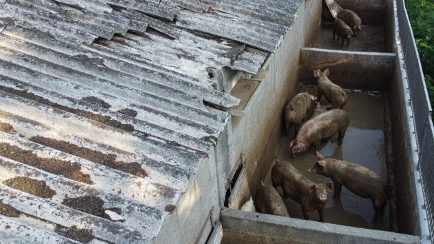 Avevamo già visitato l’allevamento l’anno scorso, e avevamo rinvenuto carcasse di maiali abbandonate in un cassone all’esterno dello stabilimento, immagini che erano state diffuse in un servizio al Tg1. A luglio di quest’anno, grazie all’utilizzo di un drone, l’associazione ha documentato le condizioni di degrado in cui versa la struttura. Sul tetto dello stabilimento sembra essere presente molto eternit, fatto che mette in pericolo la salute dei lavoratori e degli animali presenti nella struttura. Ma le problematiche ambientali non finiscono qui: alcuni cittadini hanno denunciato la presenza di un tubo di scarico in un campo vicino all’allevamento, che potrebbe essere stato utilizzato per smaltire illegalmente le deiezioni. Come d’obbligo in situazioni come queste, l’organizzazione ha denunciato la situazione alle autorità locali.