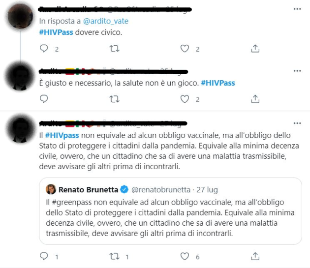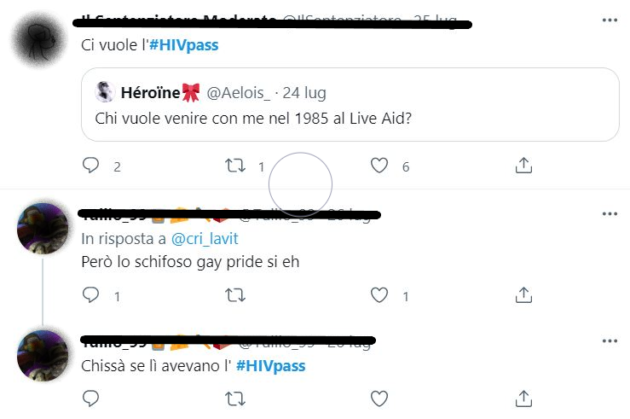 Questa premessa era necessaria per introdurre il tema di questo post, che è il seguente: su Twitter sta avendo un discreto successo l’hashtag #HIVpass. Inaugurata sulla scia delle proteste di cui sopra e sulle uscite social del leghista Claudio Borghi, la magica parolina è assurta a nuova battaglia dei contrari al green pass, che non accettando il certificato verde hanno deciso di vomitare sui social la loro omofobia. La logica sarebbe questa: se io non posso avere accesso a certi luoghi o prendere parte ad alcune attività, perché privo di green pass in quanto privo di vaccinazione, tu sieropositivo, comunque vittima di una pandemia, non puoi mescolarti con me. Non puoi venire a cena dove io pasteggio con la mia famiglia, non puoi prendere i mezzi sedendoti vicino a persone sieronegative, non puoi – insomma – avere a che fare col sottoscritto.
