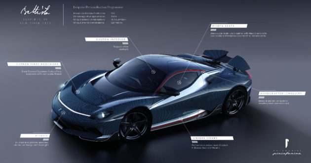 A impreziosire la Battista “New York City-inspired”, anche numerosi dettagli in alluminio satinato in nero per l’abitacolo e in rosso per la carrozzeria, poi altre rifiniture (“realizzate meticolosamente a mano per via delle forme complesse della scocca”) bianche, sul bordo inferiore della portiera.