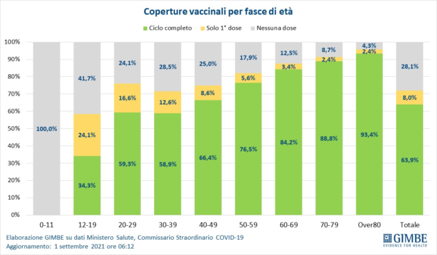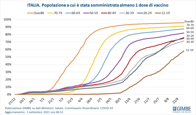 La copertura degli over 50 – “Le scorte attualmente disponibili – spiega Marco Mosti – ammontano ad oltre 7,8 milioni di dosi di vaccini a mRNA, un numero ampiamente sufficiente ad accelerare la campagna vaccinale in questa fase che precede la riapertura delle scuole”. Ancora però restano 3,34 milioni (12,2%) di over 50 che non hanno ancora ricevuto nemmeno una dose, con rilevanti differenze regionali: dal 18,6% della Sicilia al 7,6% della Puglia. A fronte di un sostanziale appiattimento dei trend di vaccinazione in queste fasce d’età, salgono invece tutte le curve degli under 50: in particolare s’impenna la fascia 12-19 e quella 20-29 che supera le percentuali di copertura delle fasce anagrafiche 30-39 e 40-49.