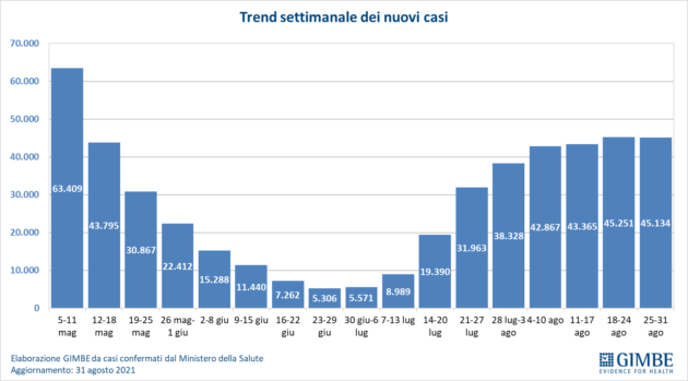 L’efficacia del vaccino da aprile ad oggi rimane stabile e superiore al 94% nel ridurre i decessi e le forme severe di malattia che richiedono ospedalizzazione e ricovero in terapia intensiva. L’efficacia si è invece abbassata dall’88,5% (periodo 4 aprile-11 luglio) al 79,7% (periodo 4 aprile-22 agosto) per quanto riguarda le diagnosi di coronavirus. Sono le conclusioni del monitoraggio della Fondazione Gimbe, che in scia al dibattito sul prolungamento della validità del green pass e sull’opportunità della terza dose, come spiega il presidente Nino Cartabellotta, ha analizzato l’efficacia vaccinale e la durata della copertura sulla base dei dati resi disponibili dall’Istituto Superiore di Sanità. Per quanto riguarda l’andamento della pandemia, invece, il rilevamento di Gimbe sulla settimana 25-31 agosto segnala una sostanziale stabilità dei nuovi casi e una frenata dell’aumento dei ricoveri in area medica (+5,4%) e in terapia intensiva (+7,9%).