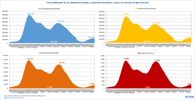 L’efficacia del vaccino – Il monitoraggio sottolinea che, in base ai dati, si rileva una progressiva riduzione dell’efficacia delle coperture vaccinali solamente nei confronti di infezioni asintomatiche e forme lievi di malattia che non necessitano di ricovero. Inoltre, tale riduzione dell’efficacia risulta inversamente proporzionale all’età: al 22 agosto l’efficacia è del 67,4% nella fascia 12-39 anni e del 77,1% in quella 40-59 anni. Visto che negli over 60 l’efficacia sulla diagnosi si mantiene superiore all’85%, per Gimbe è verosimile che tra i più giovani abbiano influito durante il periodo estivo la maggiore occasione di contatti sociali e una minore attenzione ai comportamenti individuali, che restano fondamentali per prevenire il contagio anche nelle persone vaccinate. A fronte di un aumento di ospedalizzazioni, ricoveri in terapia intensiva e decessi sia nei vaccinati che nei non vaccinati, il rapporto fra i due gruppi si mantiene pressoché stabile, con del rischio rispettivamente dell’85,3%, 89,3% e 78,9% in chi non ha ricevuto nemmeno una dose di vaccino rispetto a coloro che hanno completato il ciclo vaccinale. Infine, il numero di operatori sanitari positivi, dopo un netto calo dall’inizio della campagna vaccinale, nei mesi di luglio e agosto fa registrare una lieve risalita. Tuttavia, conclude Gimbe, è ancora presto per affermare con certezza se il fenomeno sia attribuibile ad una perdita di efficacia della copertura vaccinale o rifletta l’aumentata circolazione virale nella popolazione generale.