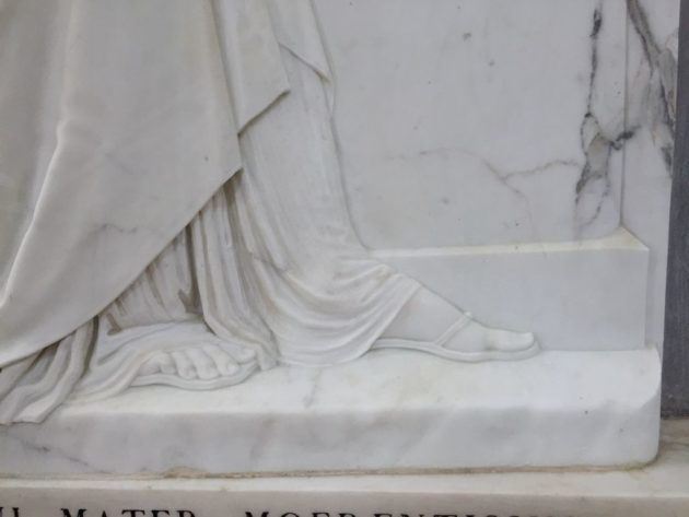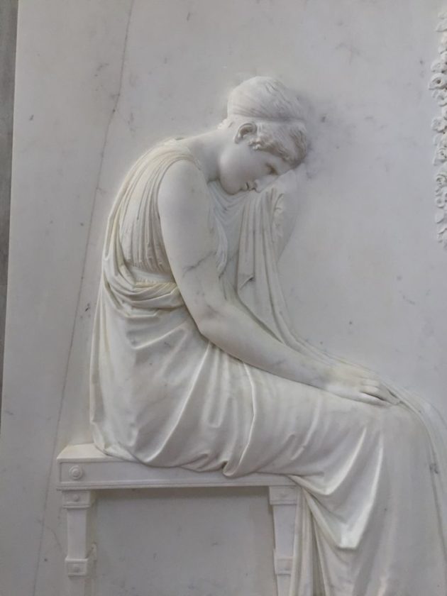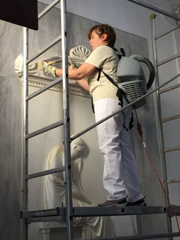 Tra l’altro il bassorilievo torna visibile dopo un recentissimo intervento di restauro – realizzato anche grazie dalla Fondazione della Comunità Bergamasca – che l’ha resa di nuovo completamente leggibile: “Ero già intervenuta sulla Stele nel 2008 – dice la restauratrice lombarda Cinzia Parnigoni – Poi avevamo programmato operazioni di manutenzione ordinaria con cadenza fissa. Tuttavia vi erano delle piccole macchie gialle, di origine organica… forse il polline di una pianta.. che si formavano sulle parti orizzontali dell’opera, come dei depositi, che non riuscivo a eliminare. Nel frattempo avevo iniziato il mio intervento di restauro al pavimento del Duomo di Milano che è ancora in corso, dove avevo avuto a che fare con delle macchie simili, poi eliminate grazie a una soluzione chimica. Ho usato lo stesso prodotto sulle macchie della Stele e queste sono finalmente scomparse. Abbiamo tutti tirato un sospiro di sollievo perché il capolavoro era tornato perfettamente leggibile. Sinceramente sono già intervenuta su opere di Canova ma ogni volta che lo faccio verifico la sua raffinatezza, la sua ricerca dell’effetto pittorico nella scultura attraverso le luci e le ombre e scopro dei nuovi dettagli”.
