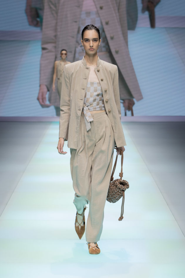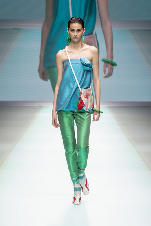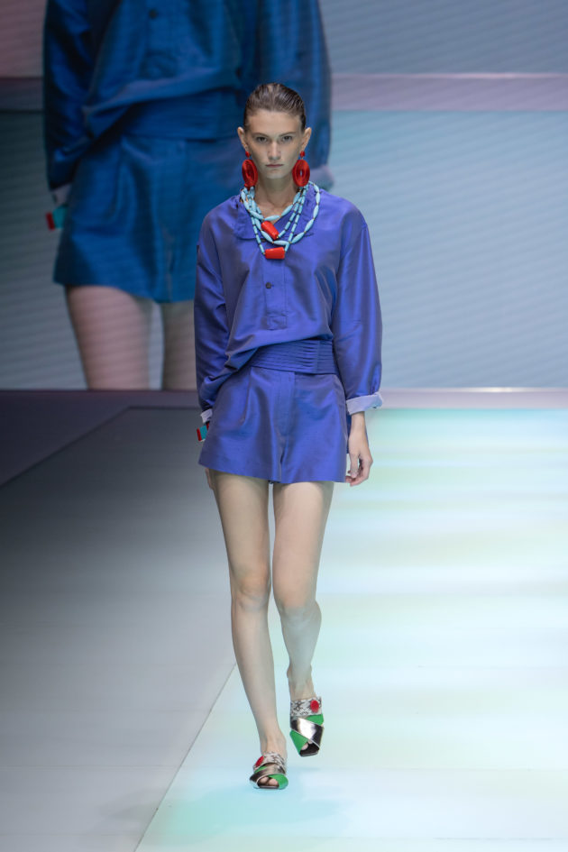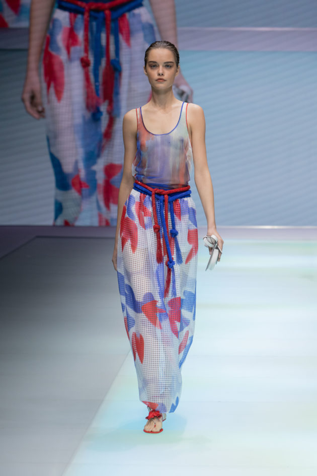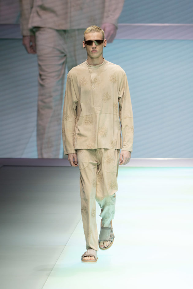 La collezione racchiude in sé tutti i canoni di Emporio, ma rinnovati. Il jeans che vediamo qui non è più quello sensuale e provocatorio che fece scandalo nel 1981: è un denim sartoriale, delicato, che si adatta ai corpi che lo vestono. C’è poi lo sportswear, altra grande invenzione di Re Giorgio, con tute, maxi felpe, shorts e sneakers dagli inserti trasparenti e il logo EA7 ben in vista. Solo non c’è traccia di nero, pochissimo spazio è riservato anche ai colori più scuri: non c’è il blu notte perché non c’è notte. C’è la luminosità abbagliante del sole di mezzogiorno, quella luce purissima tratti allucinogena che Armani ben conosce dai suoi soggiorni a Pantelleria. I pantaloni pigiama sono una cascata di seta, i tessuti si fanno trasparenti e impalpabili, le bluse si smaterializzano: è l’apoteosi della decostruzione armaniana.