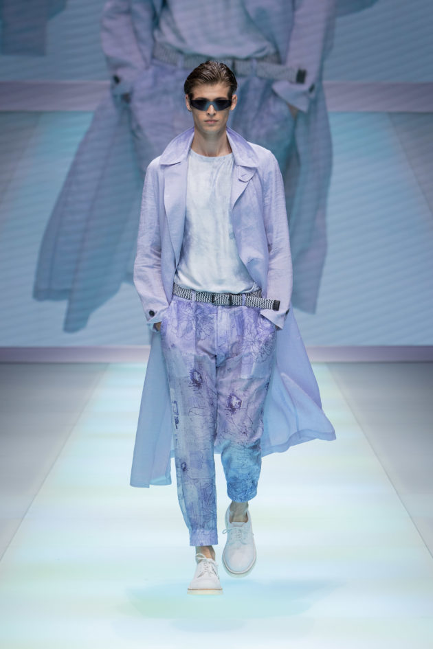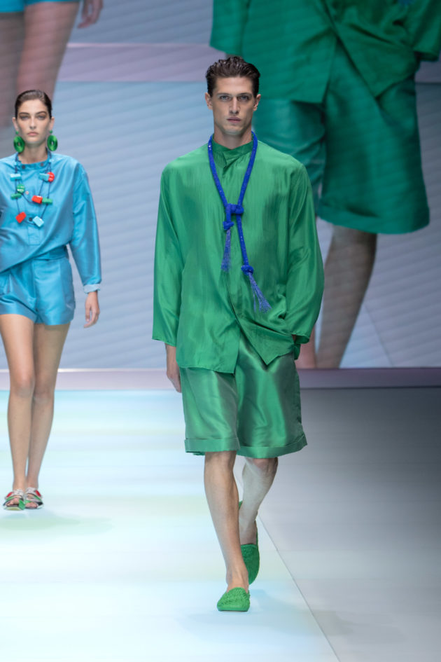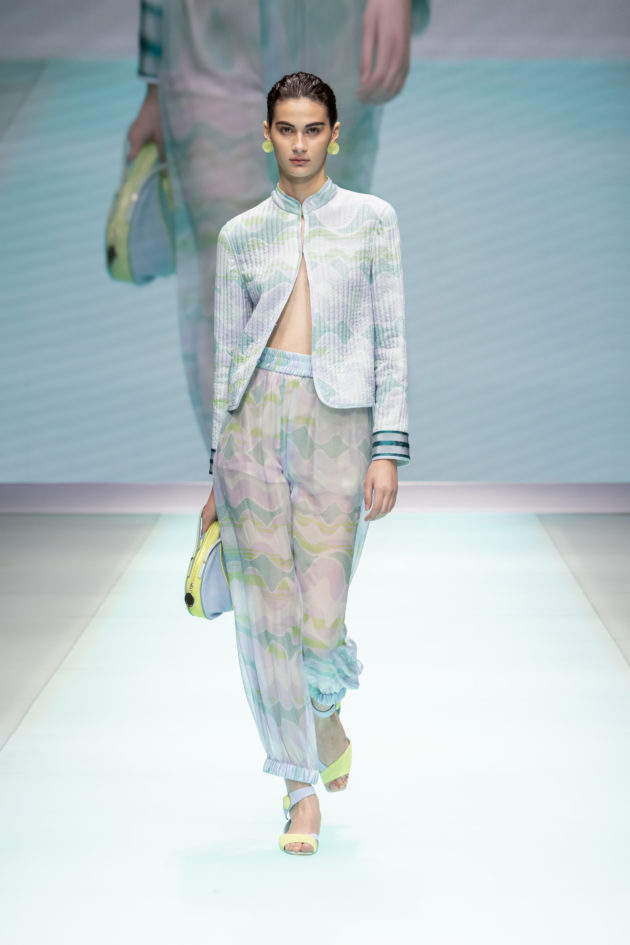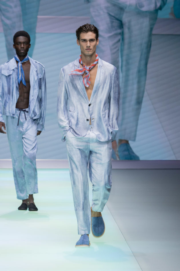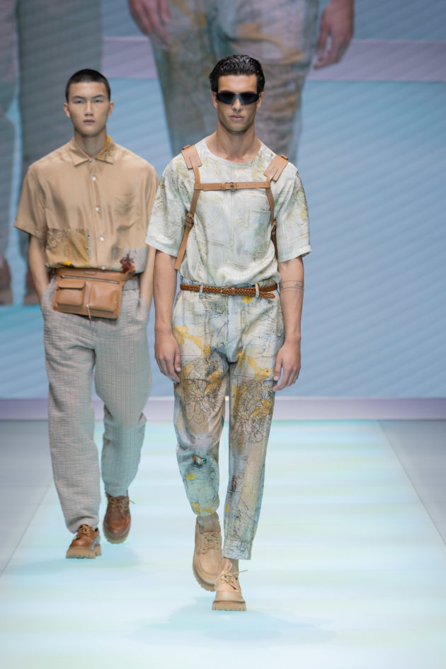 Il colore chiave dell’intera collezione è il turchese, ma di una tonalità indefinibile altrimenti che celestiale. “Chi indossa questi vestiti si sente rasserenato”, commenta Re Giorgio ed è proprio così, ci sente leggeri solo a guardarli sfilare. È un moodboard sensoriale che trasmette gioia, la stessa che emanano i toni brillanti dei paillettes che chiudono il défilée: in 17 minuti abbiamo fatto un viaggio oltre i confini conosciuti, lo stesso che possiamo immaginare guardando le cartine geografiche stampate su camicie, casacche e giacche di seta. Suggestioni di Paesi lontani, un’oasi nel deserto, un miraggio. Il tutto sempre con un taglio cosmopolita, metropolitano, attuale perché i confini che la moda di Giorgio Armani travalica sono anche quelli delle discriminazioni di ogni genere perché Emporio Armani è nato con una precisa impronta democratica nel senso più ampio del termine.