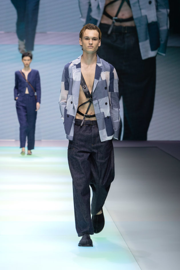 Non poteva che aprirsi con lui, il denim, il tessuto simbolo della rivoluzione messa in atto dal brand la sfilata celebrativa dei primi 40 anni di Emporio Armani. Dopo 18 lunghi mesi, l’Armani/Teatro ha riaperto le sue porte al pubblico per la prima sfilata in presenza e i mesi più bui della pandemia di Covid sono stati soppiantati dalla luce liquida che emanavano le creazioni in passerella. La collezione P/E 2022 di Emporio Armani è semplicemente celestiale. L’Aquila ci porta in alto, in altissimo, nell’Empireo dantesco, nell’etere purissimo, sulla soglia del paradiso. Poi ci riporta giù, planando con le sue grandi ali spiegate sulla Terra, tra le dune del deserto, dove le suggestioni oniriche si fanno più intense. E infine si tuffa con noi nella barriera corallina, in un tripudio di colori e riflessi cristallini, limpidi e lucenti come le scaglie dei pesci tropicali. C’è estate, c’è freschezza, c’è leggerezza. C’è un senso di libertà innato e grande voglia di viaggiare in questi capi che racchiudono tutto lo stile di Giorgio Armani declinato in Emporio.