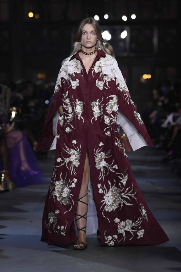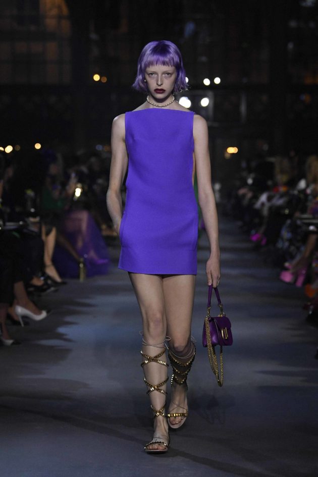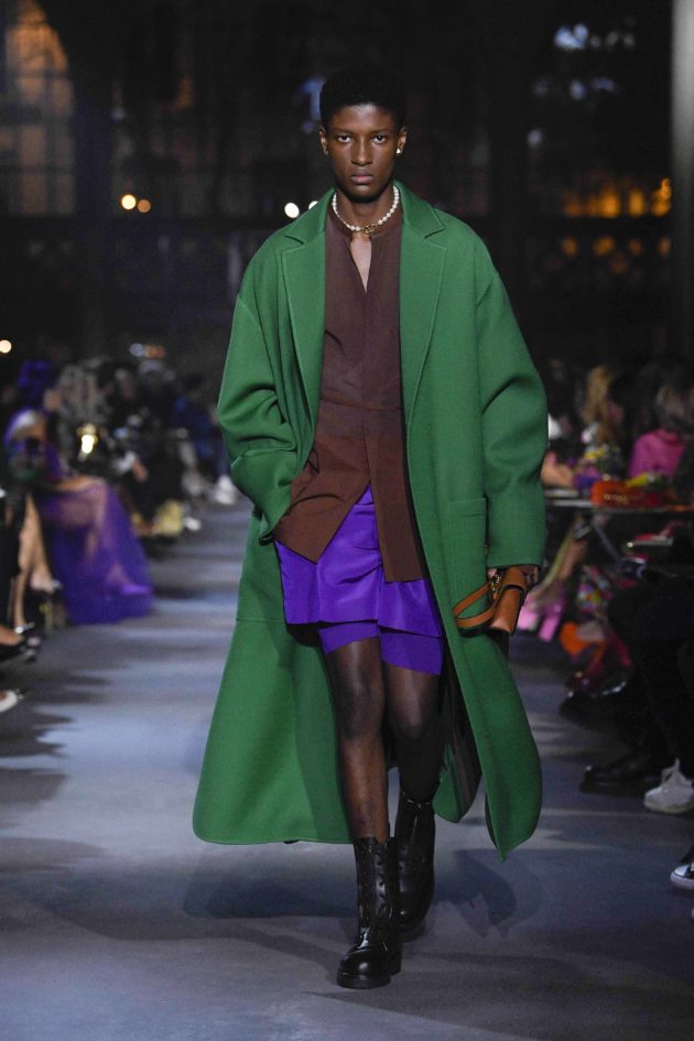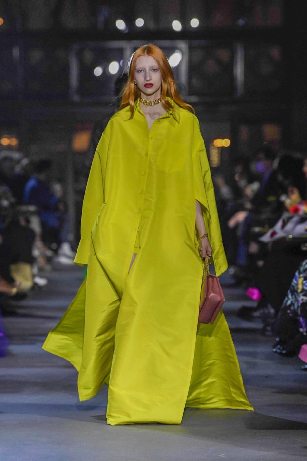 L’inversione di segno è tanto più lampante, e potente, se si guarda al tessuto chiave di questo guardaroba: il taffetà. Il materiale simbolo della Couture viene qui sdradicato completamente, lavato per essere privato di quella patina di preziosità e diventare ora camicia oversize, ora bermuda, ora giacca. Anche cappe e mantelli si distaccano dall’imponenza dell’Alta Moda per diventare cifra di stile di un vestire quotidiano. Questo procedimento, unito alla purezza dei tagli e delle linee che costituiscono gli abiti (non ha caso nel suo moodboard Piccioli tiene sempre almeno un quadro di Fontana, ndr) è ciò che più fa emergere il designer che c’è in Pierpaolo Piccioli: solo lui poteva infatti creare abiti da sera raffinatissimi da due semplici pannelli di stoffa sovrapposti ma, soprattutto, reinventare il capo simbolo di questa collezione, la camicia. È oversize e decostruita così da essere trasformista e versatile: giocando con i bottoni delle maniche e dell’allacciatura la si adatta al proprio corpo e alla propria identità. E poi il colore, anzi, i colori, quelli brillanti a cui ormai Pierpaolo ci ha abituato. “Mi piace non aggiungere parole a quello che faccio – conclude Piccioli -. Credo che l’immagine abbia una potenza molto forte: se l’idea di uguaglianza che guida la mia moda appare ben presente in passerella, è inutile aggiungere le parole perché l’immagine parla da sola. È questo che fa diventare radicale il messaggio che voglio dare”.