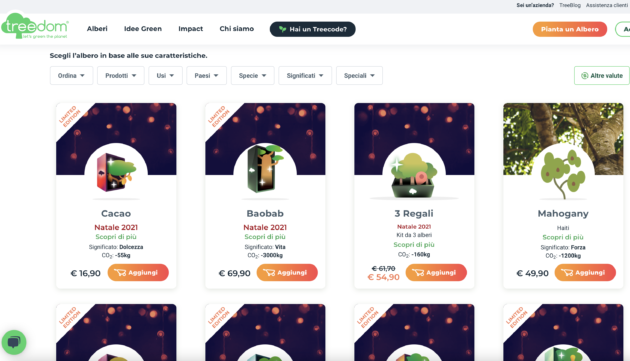 - La corsa ai regali di Natale ha un impatto tutt’altro che trascurabile per il nostro Pianeta: ecco allora che possiamo, nel nostro piccolo, fare qualcosa per rimediare, regalando un albero. Non la classica pianta, ma un albero vero e proprio che verrà piantato in aree apposite: l’iniziativa la trovate sul sito Treedom. Qui potete scegliere la specie in base ai diversi significati, il Paese dove verrà piantato e la quantità di CO2 che state contribuendo ad abbattere. Si va dai 16 euro per una pianta di cacao ai 70 di un Baobab.