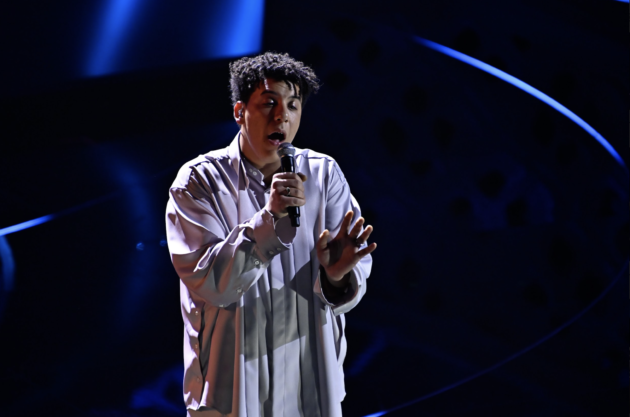 Michele Bravi: voto 7 – Cristalli, paillettes mantello nero. Nel complesso un look molto equilibrato e perfetta metafora dell'”inverno dei fiori” da lui cantato, con il tripudio di boccioli dorati che adornano la sua blusa.