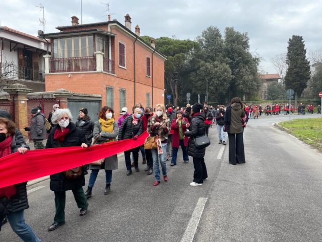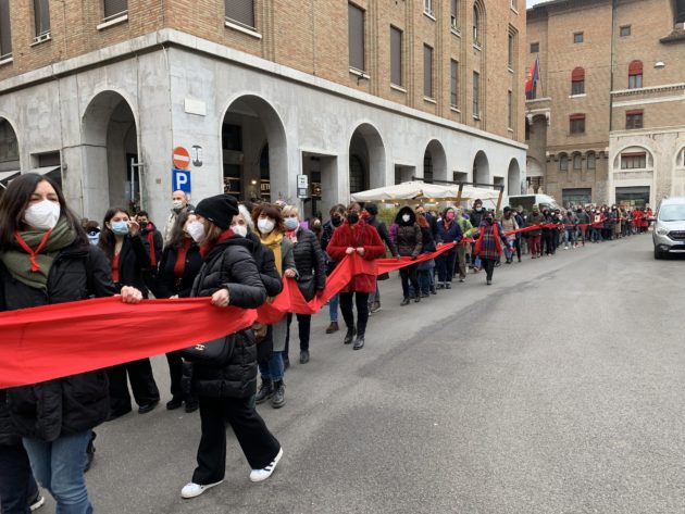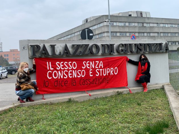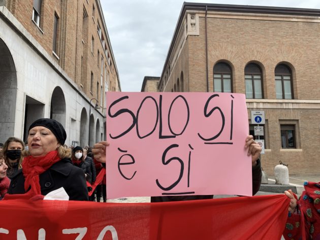 Sabato mattina un corteo di 300 persone in rappresentanza delle centinaia di associazioni si è riunito davanti alla Prefettura in Piazza del Popolo e ha attraversato il centro della città sfilando accanto a un lungo drappo rosso, fino al palazzone del tribunale. Uno striscione porpora: “Il sesso senza consenso è stupro” ha colorato per qualche minuto il muro di cinta grigio sotto la scritta “Palazzo di Giustizia”. Le attiviste della Casa delle donne di Ravenna, i centri antiviolenza della Provincia di Ravenna Linea Rosa, Demetra donne in aiuto, Sos Donna, e poi l’associazione Dalla Parte dei Minori, Udi, Maschile Femminile Plurale e Nudm Ravenna sono state le promotrici di un’iniziativa organizzata in tre giorni per esprimere con forza il dissenso verso quel “non costituisce reato” che ha concluso il primo grado di un processo per stupro che sta facendo discutere ed è arrivato in cronaca nazionale.