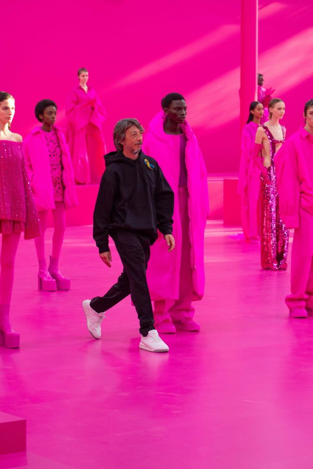 Ecco quindi che questo assolutismo consente di riconoscere e ammirare in questa collezione Autunno/Inverno 2022 l’approccio della Couture interpretato con i materiali del ready to wear, le silhouette allungate amplificate dai tacchi vertiginosi e dai collant, perché, sottolinea Piccioli, “i momenti di grande cambiamento – dal Medioevo al ‘700 – sono sempre accompagnati da un forte senso di verticalità”. I ricami floreali, le trasparenze, i cristalli, i volumi, i fiocchi e i marabù parlano del processo di design che vi è dietro. I completi cargo, le cappe, i miniati bustier disegnati dai tagli, le bluse in chiffon: tutto spinge a ridefinire la nostra percezione della moda, spogliandola di ogni narrativa superflua. Se è vero che l’immagine conta più di mille parole, con questa sfilata Pierpaolo Piccioli ci consegna il suo manifesto. E questo rosa, colore che ha sempre punteggiato le sue collezioni, ora si fa totale e assoluto: se prima c’era il rosso Valentino a definire l’allure del Palazzo, adesso c’è il Pink PP che scende in strada e si “sporca” di vita.